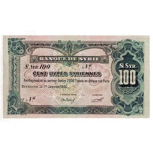 Obverse lettering BANQUE DE SYRIE CENT LIVRES SYRIENNES REMBOURSABLE AU PORTEUR CONTRE 2000 FRANCS EN CHÈQUE SUR PARIS