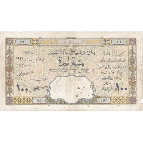 | Reverse lettering | GRAND-LIBAN BANQUE DE SYRIE ET DU GRAND-LIBAN CENT LIVRES REMBOURSABLE AU PORTEUR EN CHÈQUE SUR PARIS OU MARSEILLE À RAISON DE VINGT FRANCS PAR LIVRE CL. SERVEAU FEC. E. DELOCHE SC. |