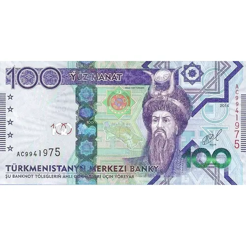 | Opis líce | ÝÜZ MANAT TÜRKMENISTANYŇ MERKEZI BANKY ŞU BANKNOT TÖLEGLERIŇ ÄHLI GÖRNÜŞLERI ÜÇIN ÝÖREÝÄR (Translation: One Hundred Manat, Central Bank of Turkmenistan, This banknote is valid for all types of payments) |