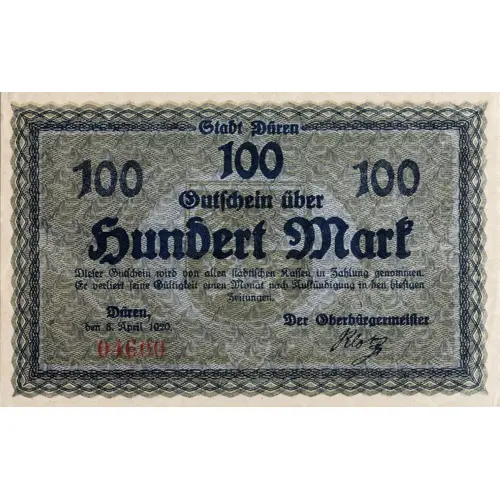 STADT DÜREN 1917 100 (Left) 100(center) 100 Right Gutschein über Hundert Mark Dieser Gutschein wird ovn allen städt. Kassen in Zahlung genommen. Er verliert sein Gültigkeit einen Monat nach Aufkündigung in den hiesigen Zeitungen. Düren ______________________ Der Oberbürgermeister den 8. April 1920 |