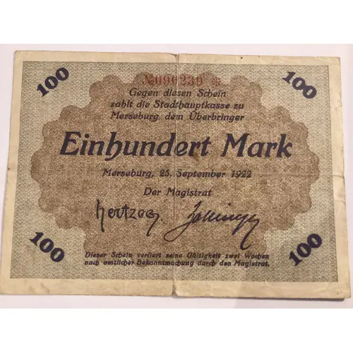 | Obverse lettering | Gegen diesen Schein zahlt die Stadthauptkasse zu Merseburg dem Überbringer Einhundert Mark. Merseburg,25.September 1922 Der Magistrat. Dieser Schein verliert seine Gültigkeit zwei Wochen nach amtlicher Bekanntmachung durch den Magistrat |