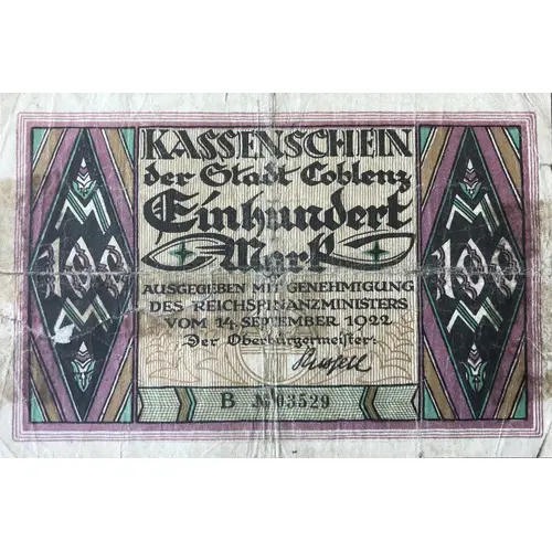 | Obverse lettering | KASSENSCHEIN der Stadt Coblenz Einhundert M 100 M Mark M 100 M AUSGEGEBEN MIT GENEHMIGUNG DES REICHSFINANZMINISTERS VOM 14. SEPTEMBER 1922 Der OBerbürgermeister |