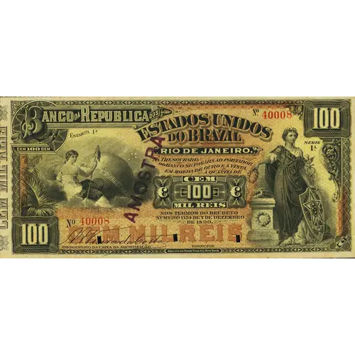 100 BANCO DA REPUBLICA DOS ESTADOS UNIDOS DO BRAZIL RIO DE JANEIRO NA THESOURARIA DO BANCO SE PAGARÁ AO PORTADOR EM MOEDA DE OURO E A VISTA, A QUANTIA DE 100 CEM MIL REIS NOS TERMOS DO DECRETO NUMERO 1154 DE 7 DE DEZEMBRO DE 1890. 100 AMERICAN BANK NOTE CO., NEW YORK (Translation: Bank of the Republic of the United States of Brazil Rio de Janeiro In The Bank`s Treasury will be paid to the carrier in gold coin and sight, the amount of One Hundred Thousand Reis Under the terms of Decree Number 1154 of December 7, 1890. 100 American Bank Note Co. New York) |