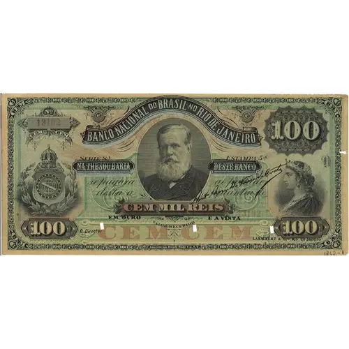 | Obverse lettering | BANCO NACIONAL DO BRAZIL NO RIO DE JANEIRO Na Thesouraria do Banco se pagará ao portador em moeda de ouro e à vista a quantia de CEM MIL REIS LAEMMERT & Co, Rio de Janeiro (Translation: National Bank of Brazil in Rio de Janeiro The Bank`s Treasury will pay to the bearer in gold coin and at sight the amount of One Hundred Thousand Reis) |