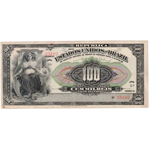 | Obverse lettering | 100 100 REPÚBLICA DOS ESTADOS UNIDOS DO BRAZIL NO THESOURO NACIONAL SE PAGARÁ AO PORTADOR DESTA A QUANTIA DE 100 CEM MIL RÉIS VALOR RECEBIDO AMERICAN BANK NOTE COMPANY, NEW YORK (Translation: Republic of the United States of Brazil At the National Treasury the holder will be paid the amount of One Hundred Thousand Reis Amount received American Bank Note Company, New York) |