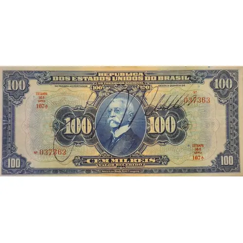| Opschrift voorzijde | REPUBLICA DOS ESTADOS UNIDOS DO BRAZIL NO THESOURO NACIONAL SE PAGARÁ AO PORTADOR DESTA A QUANTIA DE 100 100 100 100 100 100 CEM MIL REIS VALOR RECEBIDO 100 100 American Bank Note Company (Translation: Republic of the United States of Brazil In the National Treasury will be paid to the carrier of this amount of One Thousand Hundred Réis Amount Received American Bank Note Company.) |