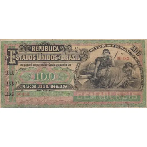 | Legenda del dritto | REPÚBLICA DOS ESTADOS UNIDOS DO BRAZIL 100 NO THESOURO FEDERAL SE PAGARÁ AO PORTADOR DESTA A QUANTIA DE AMOSTRA 100 CEM MIL RÉIS VALOR RECEBIDO CEM MIL RÉIS AMERICAN BANK NOTE CO., NEW YORK (Translation: Republic of the United States of Brazil At the Federal Treasury the holder will be paid the amount of AMOSTRA One Hundred Thousand Reis Amount received One Hundred Thousand Reis American Bank Note Co., New York) |