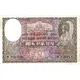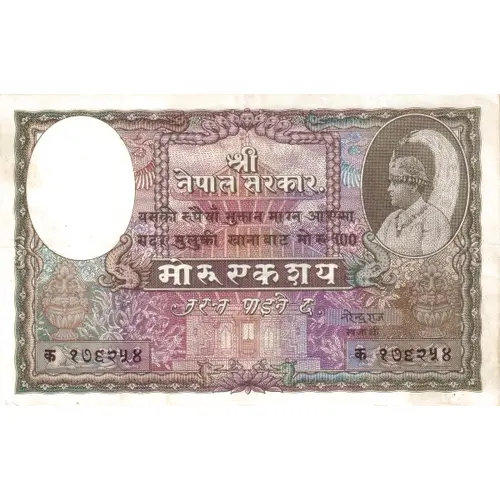 Descripción del anverso Temple in center, King Tribhuvan wearing plumed crown at right.