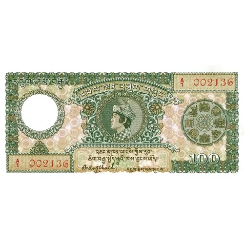 | Reverse lettering | ROYAL GOVERNMENT OF BHUTAN 100 Nu ONE HUNDRED NGULTRUMS |