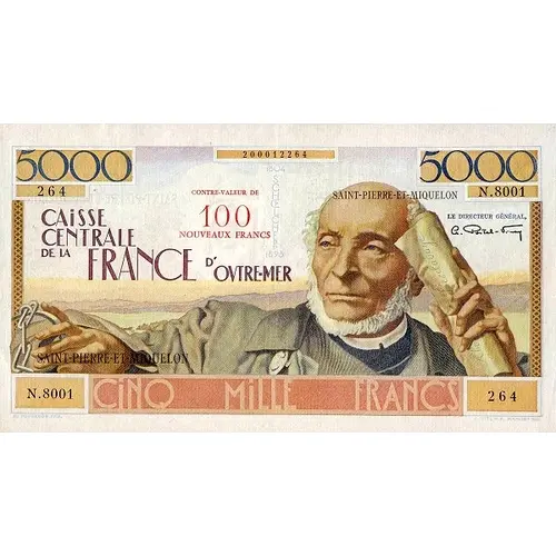 | Obverse description | Multicolor printing. The overprint `SAINT-PIERRE-ET-MIQUELON` repeated twice is printed in black. The wording is brown purple in color and the value `5000` in numbers is printed in dark blue. Numbering and signature are printed in black. The overprint `COUNTER-VALUE OF 100 NEW FRANCS` is printed in red at the location of the watermark. Pensive bust of Victor Schoelcher, French journalist and politician posing in front of a sea and mountain landscape. In his hand, the parchment of the abolition of slavery in the French colonies. A single signature: The Managing Director: A. Postel-Vinay. |