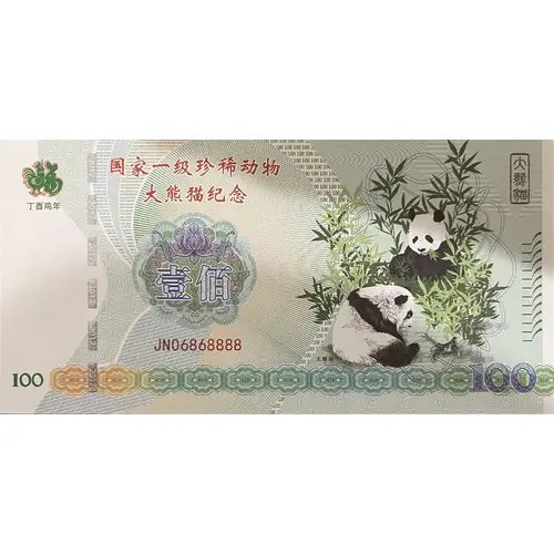 丁酉鸡年 国家一级珍稀动物 大熊猫纪念 壹佰 (Translation: Dingyou Year of the Rooster National Level One Rare Animals Giant Panda Memorial One Hundred) |