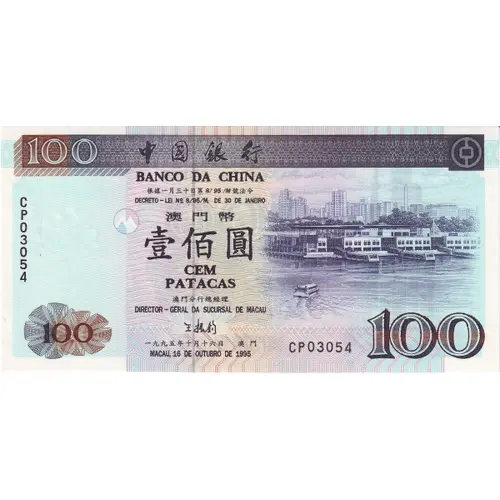 | Obverse lettering | 中國銀行 BANCO DA CHINA 根據 一月十八日第 8/95/M 號法令 DIRECTO – LEI № 8/95/M, DE 30 DE JANEIRO 澳門幣 壹佰圓 CEM PATACAS 澳門分行總經理 DIRECTOR - GERAL DA SUCURSAL DE MACAU 一九九五年十月十六日 澳 門 MACAU, 16 DE OUTUBRO DE 1995 |