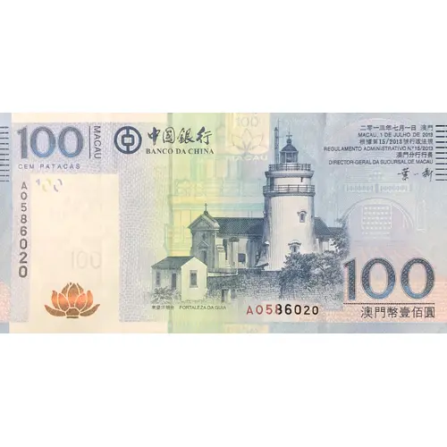 | Obverse lettering | 100 MACAU CEM PATACAS 中國銀行 BANCO DA CHINA 二零一三年七月一日 澳門 MACAU, 1 DE JULHO DE 2013 根據第15/2013號行政法規 REGULAMENTO ADMINISTRATIVO N.ᵒ 15/2013 澳門分行行長 DIRECTOR-GERAL DA SUCURSAL DE MACAU 東望洋炮台 FORTALEZA DA GUIA 100 澳門幣壹百圓 (Translation: Bank of China 2013 July 1 Macau According to Administrative Regulation No. 15/2013 Macau Branch President Search Results Web results Oriental Coastal Battery Guia Fortress One Hundred Macanese Patacas) |