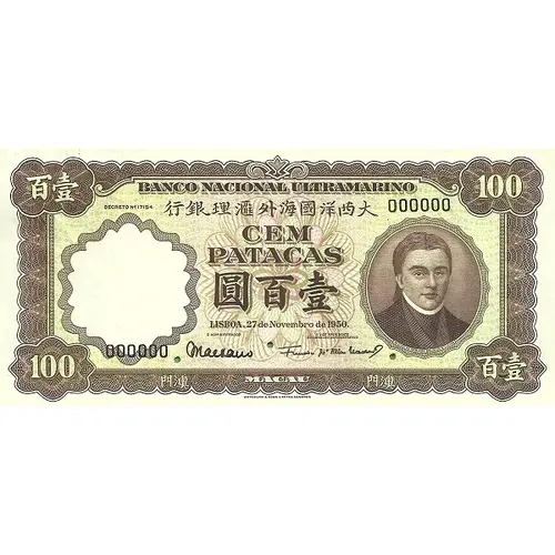 BANCO NACIONAL ULTRAMARINO DECRETO №17154 行銀理滙外海國洋西大 CEM PATACAS 圓百壹 LISBOA, 27 de Novembro de 1950. O ADMINISTRADOR | O PRESIDENTE DO CONSELHO ADMINISTRATIVO 門澳 MACAU 門澳 WATERLOW & SONS LIMITED, LONDRES |