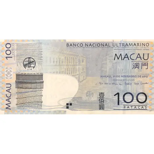| Obverse lettering | BANCO NACIONAL ULTRAMARINO REGULAMENTO ADMINISTRATIVO N.ᵒ 21/2013 MACAU 澳門 MACAU, 11 DE NOVEMBRO DE 2013 CONSELHO DE ADMINISTRAÇÃO 壹 佰 100 圓 PATACAS LARGO DO SENADO 議事亭前地 (Translation: National Overseas Bank Administrative Regulation No. 21/2013 Macau 11th of November, 2013 Board of Directors One Hundred Patacas Senate Square) |
