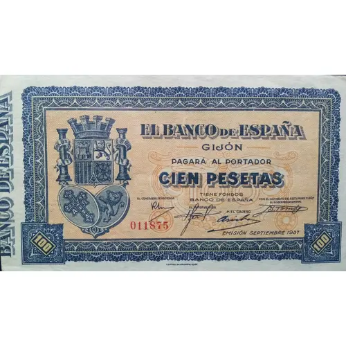 | Obverse lettering | EL BANCO DE ESPAÑA / GIJÓN PAGARÁ AL PORTADOR CIEN PESETAS TIENE FONDOS / BANCO DE ESPAÑA EMISIÓN SEPTIEMBRE 1937 (Translation: The Bank of Spain - Gijón Will pay the bearer One Hundred Pesetas Have funds / Bank of Spain Issue September 1937) |