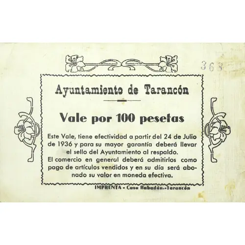 Legenda del dritto Ayuntamiento de Tarancón Vale por 100 pesetas Este Vale, tiene efectividad a partir del 24 de Julio de 1936 y para su mayor garantía deberá llevar el sello del Ayuntamiento al respaldo. El comercio en general deberá admitirlos como pago de artículos vendidos y en su día será abonado su valor en moneda efectiva.