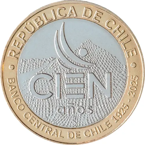 Features the logo of Banco Central de Chile alongside the phrase “CIEN años” in the center of the core. Above, on the outer ring, appears the legend “REPÚBLICA DE CHILE”. Below, within the core, a stylized mountain represents a simplified depiction of the Andes. At the bottom of the ring, the inscription “BANCO CENTRAL DE CHILE 1925 – 2025” is shown. The mintmark (Ceca). |