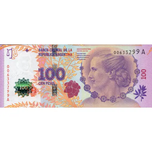 | Obverse lettering | BANCO CENTRAL DE LA REPUBLICA ARGENTINA CIEN PESOS Maria Eva Duarte de Perón 07 05 1919 - 26 07 1952 Como mujer siento en el alma la cálida ternura del pueblo de dónde vine y a quien me debo (Translation: Central Bank of the Argentine Republic One hundred Pesos Maria Eva Duarte de Perón 07 May 1919 - 26 July 1952 As a woman I feel in my soul the warm tenderness of the people where I came from and to whom I owe) |