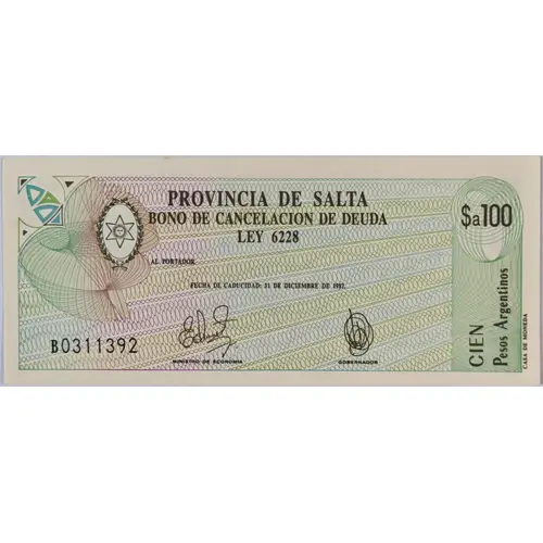 PROVINCIA DE SALTA BONO DE CANCELACION DE DEUDA LEY 6228 AL PORTADOR FECHA DE CADUCIDAD: 31 DE DICIEMBRE DE 1987. MINISTRO DE ECONOMIA GOBERNADOR CIEN Pesos Argentinos CASA DE LA MONEDA (Translation: Salta Province debt cancellation bond law 6228 To the carrier Date of expiry: 31st of December 1987 Economy Minister Governor 100 Pesos Argentinos The Currency House) |