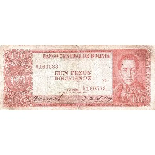 100 BANCO CENTRAL DE BOLÍVIA CIEN PESOS BOLIVIANOS LA PAZ, LEY DE 13 DE JULIO DE 1962 100 100 |