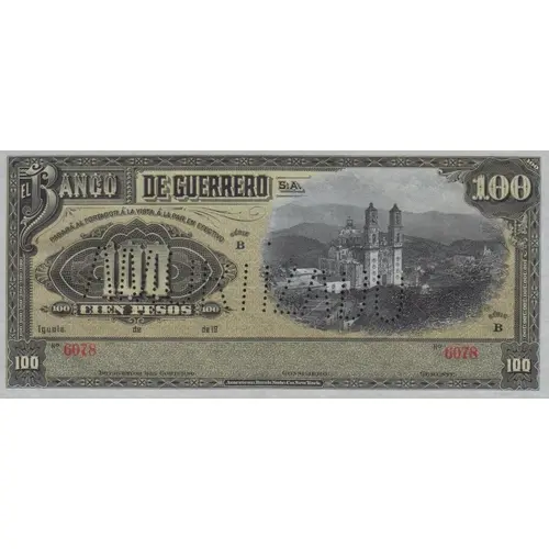 | Obverse lettering | El Banco de Guerrero S.A. Pagará al portador á la vista, á la par, en effectivo Cien Pesos Iguala, de de 19 (Translation: The Bank of Guerrero S.A. will pay the bearer on sight, at par, in cash One Hundred Pesos) |
