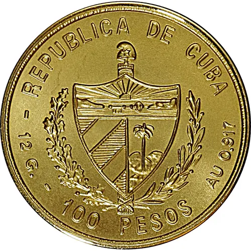 (Translation: Republic of Cuba 12g. 100 Pesos gold 0.917)
