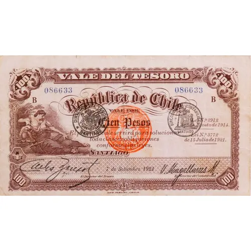 | Obverse lettering | VALE DEL TESORO República de Chile Vale por Cien Pesos. El presente vale servirá para solucionar toda classe de obligaciones conforme a las leyes. Ley nº 2912 de 3 de Agosto de 1914. Lei nº 3772 de 15 Julio de 1921. SANTIAGO 7 de Setiembre 1921 IMP. FISCAL - CHILE (Translation: Treasure Coupon Republic of Chile Worth for One Hundred Pesos. This voucher will be used to solve all kinds of obligations according to the laws. Law no. 2912 of August 3, 1914. Law no. 3772 of July 15, 1921. Santiago September 7, 1921) |