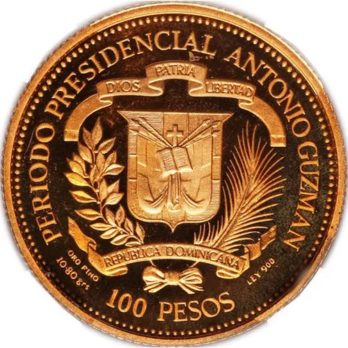 | Obverse lettering | PERIODO PRESIDENCIAL ANTONIO GUZMAN 100 PESOS ORO FINO 10.80GR LEY 900 (Translation: Antonio Guzman Presidential Period Fine Gold 10.80 Grams .900 Purity God, Homeland, Freedom Dominican Republic) |