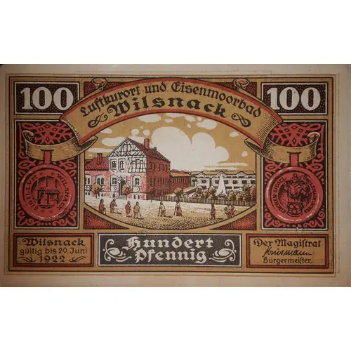(Translation: Climatic Health Resort and Iron-Moor Bath »Wilsnack« Wilsnack, valid until 20th of June 1922 One hundred Pfennig The Magistrate »Krussmann« Mayor)