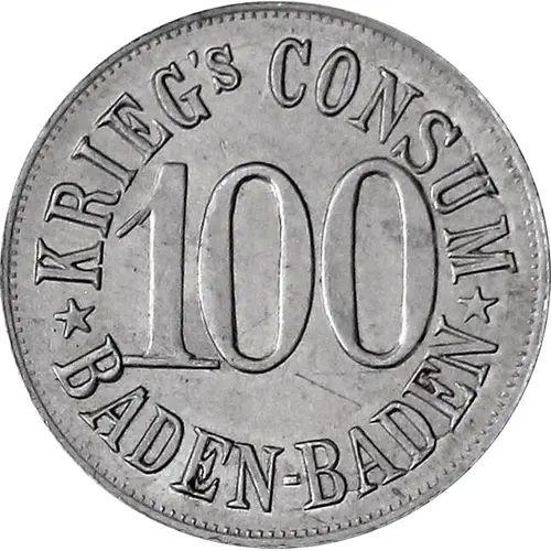 | Obverse lettering | KRIEG`S CONSUM 100 BADEN-BADEN |