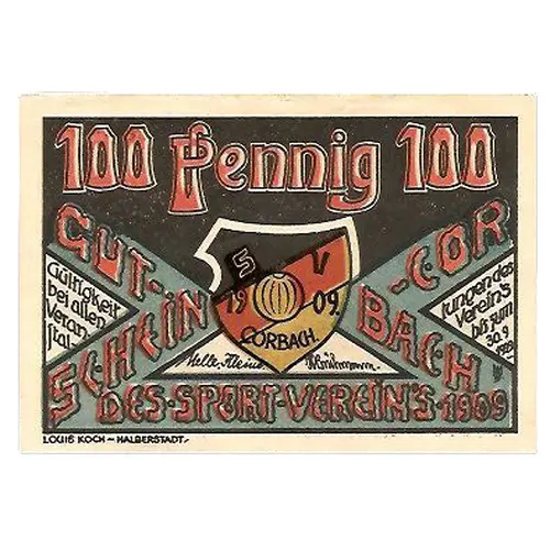 | Opis líce | Gut-Schein des sport - vereins .1909 CORBACH 100 pfennig 100 |