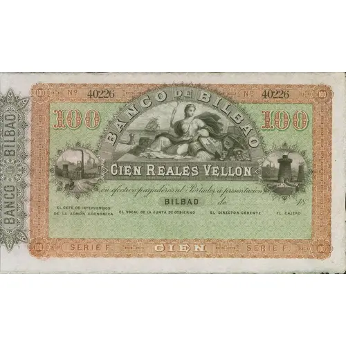 Obverse lettering 100 BANCO DE BILBAO CIEN REALES VELLON en efectivo pagaderos al portador a presentación. Bilbao ... de ... 18 ...