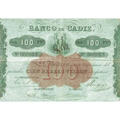 | Obverse lettering | BANCO DE CADIZ SON 100 Rs. Von. El Banco tiene a disposición del portador CIEN REALES VELLÓN en efectivo EL COMISARIO REGIO / EL DIRECTOR / EL INTERVENTOR / EL CAJERO (Translation: Bank of Cádiz It`s 100 Rs. Von. The Bank has at the disposal of the bearer One Hundred Reales Vellón in cash The Royal Commissioner / The Director / The Controller / The Cashier) |