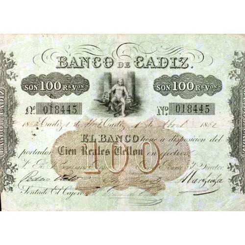 | Obverse lettering | BANCO DE CADIZ SON 100 Rs. Von. EL BANCO tiene a disposición del portador Cien Reales Vellon en efectivo (Translation: Bank of Cádiz It`s 100 Rs. Von. The Bank has at the disposal of the bearer One Hundred Reales Vellón in cash) |