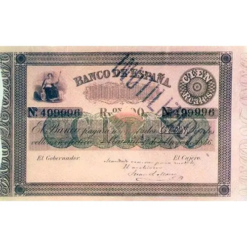 | Obverse lettering | BANCO DE ESPAÑA CIEN Reales Rv ON 100. El Banco pagará al portador CIEN Reales vellón en efectivo Madrid 1º de Mayo de 1856. El Gobernador El Cajero (Translation: Bank of Spain One Hundred Reales Reales Vellon 100 The Bank will pay the bearer One Hundred Reales vellon in cash Madrid, May 1, 1856. The Governor The Cashier) |