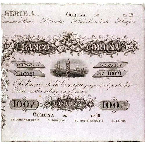 | Obverse lettering | BANCO DE LA CORUÑA El Banco de la Coruña pagará al portador Cien reales vellon en efectivo 100 r/s CORUÑA 100 r/s CORUÑA ... DE ... DE 18... EL COMISARIO REGIO / EL DIRECTOR / EL VICEPRESIDENTE / EL CAJERO (Translation: Bank of A Coruña The Banco de la Coruña will pay the bearer One hundred reales vellon in cash 100 r/s Coruña 100 r/s Coruña... of... of 18... The Royal Commissioner / The Director / The Vice President / The Cashier) |