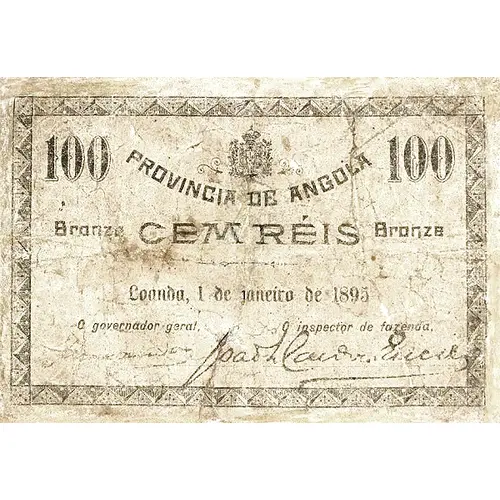 PROVINCIA DE ANGOLA Bronze CEM RÉIS Bronze Loanda, 1 de janeiro de 1895 (Translation: Province of Angol, One Hundred Réis, Luanda, 1 January 1895) |