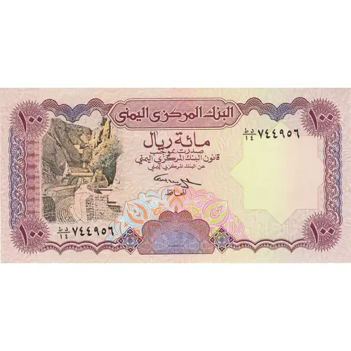 | Chữ khắc mặt sau | CENTRAL BANK OF YEMEN One Hundred Rials |