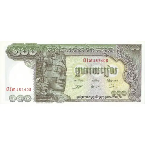 | Reverse lettering | BANQUE NATIONALE DU CAMBODGE CENT RIELS |