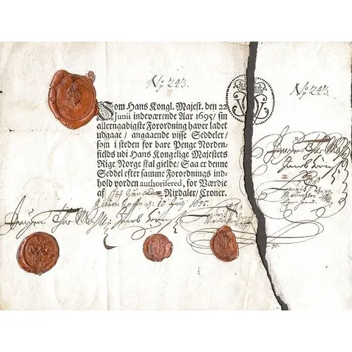 | Obverse lettering | CVC Som Hans Kongl. Majeſt. den 22 Junii indebærende Aar 1695/ sin ailernaadigſte Forordning haver ladet udgaae / angaaende diſſe Seddeler / ſom i ſteden for bare Penge Norden = sields udi Hans Kongelige Majeſtats Rige Norge ſkal gielde/ Saa er denne Seddel efter ſamme Forordnings ind = hold vorden authoriſeret, for Værdie af et hundrede Rixdaler/Croner. Kiøbenhafn den 10 July · 1695 |