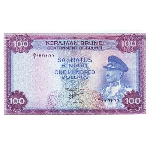 Legenda do anverso KERAJAAN BRUNEI GOVERNMENT OF BRUNEI SA-RATUS RINGGIT ONE HUNDRED DOLLARS SULTAN