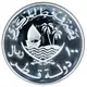 Emblem of Qatar consisting of two crossed bent swords, and between them a sailing ship (dhow) sailing on waves beside an island with two palm trees. Value. |
