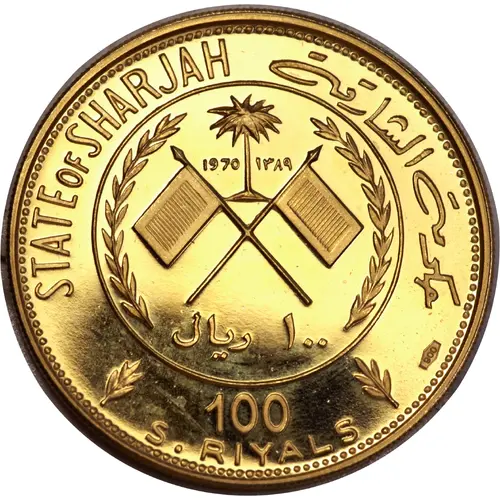 نوشته‌های روی سکه STATE OF SHARJAH حكومة الشارقة 1970 ١٣٨٩ ١٠٠ ريال 100 S. RIYALS [900]