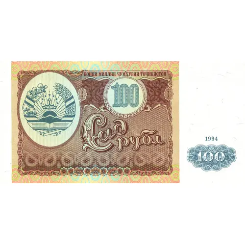 | Obverse lettering | БОНКИ МИЛЛИИ ҶУМҲУРИИ ТОҶИКИСТОН 100 Сад рубл 1994 (Translation: National Bank of the Republic of Tajikistan, One Hundred Rubles) |