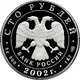 | Obverse description | In the centre - the Emblem of the Bank of Russia [the two-headed eagle with wings down, lower - the semicircular inscription - `БАНК РОССИИ` (BANK OF RUSSIA)] framed by a circle of dots and inscriptions along the rim: at the top - `СТО РУБЛЕЙ` (ONE HUNDRED ROUBLES), at the bottom - the year of issue `2002`, the letters to the left indicate the metal sign and the fineness, to the right - the fine metal content and the mint trade mark. |