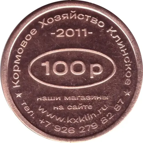 | Obverse lettering | КОРМОВОЕ ХОЗЯЙСТВО КЛИНСКОЕ -2011- 100 р НАШИ МАГАЗИНЫ НА САЙТЕ WWW.KXKLIN.RU * ТЕЛ. +7 926 279 82 87 (Translation: FODDER FARM KLINSKOE -2011- 100 p OUR STORES ON THE WEBSITE WWW.KXKLIN .RU * TEL. +7 926 279 82 87) |