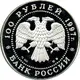| Obverse description | The two-headed eagle designed by artist I. Bilibin. The inscriptions along the rim: at the top — «100 РУБЛЕЙ 1997 г.» (100 ROUBLES 1997), at the bottom — «БАНК РОССИИ» (BANK OF RUSSIA). The letters below indicate the metal sign, the fineness, the fine metal content and the mint trademark. |