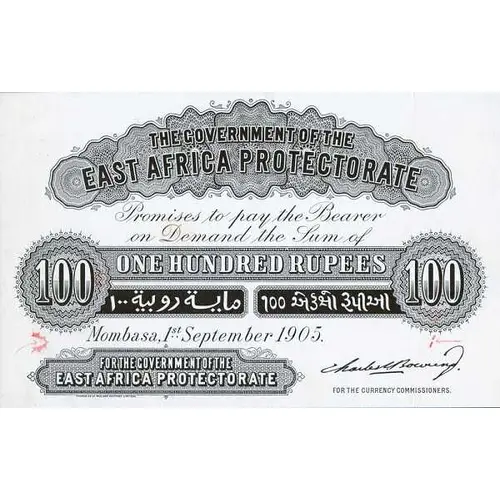 | Obverse lettering | THE GOVERNMENT OF THE EAST AFRICA PROTECTORATE PROMISES TO PAY THE BEARER ON DEMAND THE SUM OF ONE HUNDRED RUPEES FOR THE GOVERNMENT OF THE EAST AFRICA PROTECTORATE |