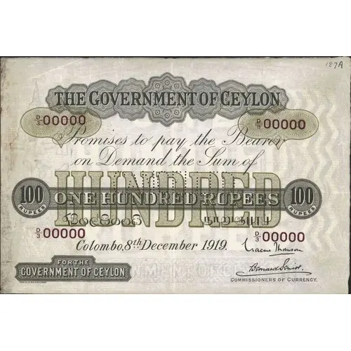 Obverse lettering THE GOVERNMENT OF CEYLON Promises to pay the Bearer on Demand the Sum of ONE HUNDRED RUPEES Colombo, 8th. December 1919. FOR THE GOVERNMENT OF CEYLON